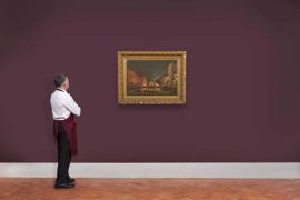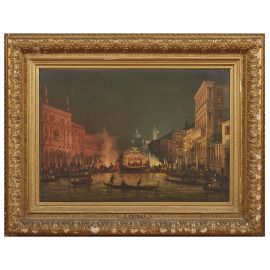 Il plebiscito del Veneto del 1866, conosciuto ufficialmente anche come Plebiscito di Venezia, delle province venete e di quella di Mantova, avvenne nelle giornate di domenica 21 e lunedì 22 ottobre e sancì l'annessione al regno d'Italia delle terre cedute alla Francia dall'Impero austriaco a seguito della Terza guerra d'indipendenza. Vittorio Emanuele giunse a Venezia il 7 novembre per ripartire alla volta di Udine il 12 novembre e la città lagunare fu sconvolta dalla gioiosa reazione della popolazione e da cinque giornate di festeggiamenti. La stampa dette grande risalto all’evento e molti dipinti consegnarono alla memoria gli episodi più salienti delle celebrazioni, tra cui ricordiamo il grande dipinto di Gerolamo Induno Vittorio Emanuele a Venezia, oggi conservato al Museo del Risorgimento di Milano. Numerose furono le opere eseguite anche da quegli artisti che venivano definiti ‘pittori di prospettive’, tra i quali Giovanni Grubacs, che in tale maniera continuavano la tradizione settecentesca dei celebri ingressi di principi e ambasciatori. Giovanni Grubacs, testimone tra più rappresentativi della tradizione vedutistica veneziana dell’800, tramanda alla nostra memoria lo storico evento con una coppia di dipinti, qui presentati in catalogo, quale testimonianza della gioiosa reazione del popolo veneto all’avvenimento, immortalando una scena diurna e una notturna. Del resto, l’attenzione del pittore per ricercati effetti di luce era ben nota negli esiti della spettacolarità dei notturni, in cui le architetture dei palazzi sono accese da inattesi bagliori (come le note Festa notturna sul Canal Grande e La festa del Redentore). Abilità che in questo caso Grubacs sfrutta nel ritrarre la folla festante che accoglie la barca del Re tra lo sventolare di vessilli italiani. La scena fissa nella memoria il momento in cui la barca con il Re attraversa il Canal Grande, ove i bagliori dei fuochi e delle lanterne illuminano a destra Palazzo Vendramin Calergi e a sinistra Palazzo Belloni Battaglia, Fondaco del Megio e Fondaco dei Turchi, mentre sullo sfondo si stagliano la cupola e il campanile della chiesa di Santa Lucia.