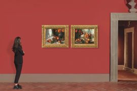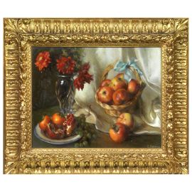 COPPIA DI NATURE MORTE CON FIORI E FRUTTA