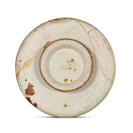 in maiolica dipinta in policromia con blu di cobalto, verde ramina, bruno di manganese, giallo antimonio nei toni del giallo e dell’arancio; diam. cm 25,7, diam. piede cm 13,4, alt. cm 5,5