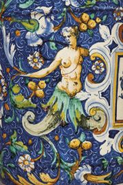 Il grande albarello ha corpo cilindrico, rastremato verso il basso, con spalla e piede fortemente arrotondati e divisi da una netta demarcazione sottolineata da una filettatura a rilievo; il collo cilindrico è basso terminante in un orlo appena appena estroflesso. La decorazione, che interessa l’intera superficie, vede sul fronte al centro un alto cartiglio rettangolare racchiuso in una complessa cornice, al cui centro campeggia la scritta in caratteri gotici Mostarda.f, sormontata da un medaglione ovale con ritratto maschile barbato, rivolto a sinistra e con il capo coperto da un cappello a sacco di colore bruno violaceo. Sotto il cartiglio è dipinto invece un viso maschile a guisa di mascherone, mentre ai lati due splendide figure di sirene, delineate con sapienza, spiccano nel fondo intessuto dal caratteristico motivo a maglie stette con girali fogliate, piccoli frutti, ghiande, foglie di acanto e piccole corolle multipetalo su fondo blu cobalto decorato a sgraffio. Sulla faccia opposta, entro una cornice robbiana realizzata in una inconsueta versione a foglie appuntite di colore blu legate da un nastro sottile accompagnato da piccoli frutti tondeggianti e centrata da corolle aperte, spicca la figura di un condottiero con lorica e capo ornato da elmo piumato, posto su uno sfondo giallo intenso. Un ritratto con impostazione analoga si ritrova in una boccia della bottega di Mastro Domenico esposta nella mostra della Galleria Canelli nel 1990 (n. 16), ma la figura del nostro albarello rispecchia la grafia veloce e asciutta associata alla mano del maestro della bottega. Un ritratto di uomo barbato presente in un esemplare della collezione della Fondazione Cini di Venezia costituisce un esempio stilistico nella modalità di delineare questo tipo di ritrattistica, e la qualità è senza dubbio la stessa dei ritratti presenti in una splendida boccia della collezione Perez di Palermo. Tuttavia è nelle figure di sirena e in alcuni dettagli, testimoni di un sapiente dominio della pittura, che ci pare di ravvisare la possibile opera del maestro, o comunque di un pittore di alta mano, nella realizzazione dell’opera. Si vedano a confronto soprattutto i piatti istoriati di Mastro Domenico, tre dei quali all’Herzog Anton Ulrich Museum di Braunschweig di Amburgo ne recano la firma autografa. In questo caso l’elevatissima qualità dell’opera e la realizzazione morfologica e decorativa suggeriscono una committenza importante.