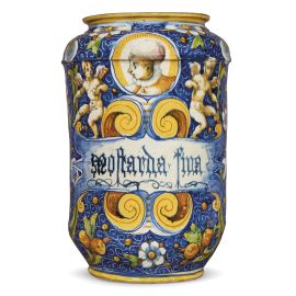 L’elegante ornato che accompagna il cartiglio e le notevoli dimensioni del vaso sono piuttosto rare, spesso associate al preparato di “Mostarda Fina”, come evidente nella raccolta qui presentata, con qualità e scelta decorativa di carattere eccezionale. Alcuni confronti per l’impostazione del decoro ci derivano dal saggio sulla mostra della Fondazione Cini, nella quale erano stati presentati due albarelli di grandi dimensioni della collezione Cora di Faenza (inv. nn. 21196 e 21325), anch’essi caratterizzati dalla scritta che richiama la Mostarda Fina e da ritratti disposti in medaglioni. La morfologia dell’opera qui in analisi tuttavia richiama opere di grande importanza, spesso associate alla mano del Maestro di bottega, come ad esempio il cilindrone della collezione Bayer di Milano con due putti che accompagnano il cartiglio, oppure il vaso molto prossimo e coerente per morfologia e scelte decorative nelle collezioni del Palais des Beaux Arts di Lille. Questa tipologia di vaso, ben rappresentata in questo stesso catalogo da più esemplari, era presente nelle dimore nobiliari, dove era frequente l’uso cospicuo della mostarda in cucina, uso ormai approfondito dagli studi e ricordato dal recente lavoro sui vasi veneziani di Riccardo Perale. E la destinazione di questi vasi ai palazzi nobiliari giustificava dunque la ricercatezza nel decoro, che tuttavia in quest’opera unisce la decorazione tradizionale dei Santi conventuali alla più laica versione del decoro attorno al cartiglio.