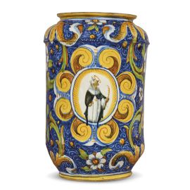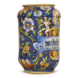 Il grande albarello ha corpo dotato di spalla e piede fortemente arrotondati, divisi da una netta demarcazione sottolineata da una filettatura a rilievo, il collo cilindrico è basso terminante in un orlo appena appena estroflesso. La decorazione interessa l’intera superficie e vede sul fronte una ricca decorazione a circondare il cartiglio farmaceutico in cui campeggia la scritta in caratteri gotici mostarda. fina, cartiglio sagomato e marcatamente ombreggiato agli estremi, inserito in un motivo a “cartocci” a doppia voluta su cui campeggia un medaglione ovale che contiene il ritratto di un giovane uomo, accanto al quale due Erotini seduti guardano verso il centro. Il piccolo ritratto maschile con copricapo a sacco trova curiosamente riscontro in un vaso presente in questa stessa vendita, ama anche in un piatto a fondo berettino del Museo del Bargello di Firenze (inv. n. 1932M) assegnato da Marino Marini alla produzione veneta della metà del XVI secolo. Sulla faccia opposta entro una cornice a cartocci, come da consuetudine nelle opere della bottega, è dipinta la figura di un santo domenicano caratterizzato dalla palma del martirio (San Pietro da Verona?), e tutto intorno il tipico motivo decorativo a grandi fiori e foglie d’acanto arricciate, disposto a maglie larghe sul fondo blu cobalto decorato a graffiture.