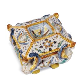 in maiolica dipinta in policromia con giallo, verde rame, blu di cobalto e rosso ferro. Corpo di forma classica a cofanetto su quattro zampe ferine con quattro sfingi alate a rilievo agli angoli, le ali qui dipinte in un blu cobalto intenso. Il decoro a grottesche in forma molto semplificata è unito ai lati da alcune teste di amorini alternati a un motivo diamantato, mentre la vaschetta superiore è decorata con un volatile ad ali spiegate. Foggiate a stampo, queste saliere costituivano un prodotto d’uso di grande qualità, delle quali si conoscono fogge differenti prodotte in molte delle fornaci rinascimentali. La forma si attarda nella produzione di Deruta, e la nostra trova riscontro ad esempio in una saliera del Museo di Deruta con foggia analoga; cm 10,8x14x13