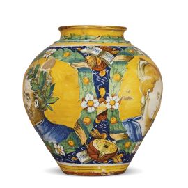 in maiolica dipinta a policromia in blu, giallo, giallo arancio, verde ramina in più tonalità, bianco di stagno, manganese nel tono del viola e del nero marrone. Sul fondo etichetta di provenienza ALTOMANI - PESARO; alt. cm 28,6, diam. bocca cm 13,4, diam. piede cm 12,2