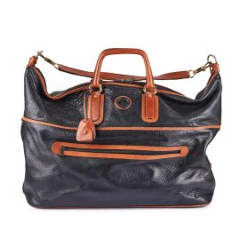 Resistente pelle nera con dettagli e rifiniture in color cuoio, come la tracolla staccabile; tasca esterna con zip e doppia tasca esterna aperta. Metalleria in ottone color oro e logo in pelle frontale; piedini in ottone alla base. Corredato di portaindirizzi.