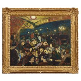La scena notturna e animata di Café de la Coupole, uno dei ritrovi del bel mondo nel trasgressivo Montparnasse, sembra tradurre in pittura il pensiero espresso dall’artista nell’ Autobiografia e citato ai margini di una piccola, sofisticata rassegna tenutasi alla Permanente nel 1998 in cui compare per la prima volta il nostro dipinto (C.Vela, in Una stanza a Montmartre.., cit., p. 116). Bucci registra le impressioni di una notte di festa, è il 14 luglio, alla Porte S.Martin: "Colori della folla, di notte: nero, grigio, tortora, verde, giallo, rosso giallo,bianco, giallo di Napoli. Il blu fa verde: l'arancio salmone. I chiari sugli scuri, taglientissimi; gli scuri tra loro, fusi. Conta l'arabesco, il rilievo non c'è. Le luci per terra, verdi". Con la stessa raffinata cromia il pittore coglie nei volti, negli atteggiamenti, nelle ricercate fogge dei cappellini alla moda e persino nelle straordinarie nature morte di bottiglie e bicchieri sui tavolini, l'elegante individualità di una folla inquieta e mondana che, nell' intrattenimento di sorvegliati conversari, ammira ed è ammirata dall'animato passeggio di pedoni e carrozze che scorrono sul boulevard, rischiarato da luci elettriche. Nel 1914, al termine del suo soggiorno parigino iniziato otto anni prima, Bucci dipinge con lo stesso tratto espressionistico alcune altre vivaci immagini di folla; in aprile, espone alla Galleria Choiseul con Picasso, Utrillo e Van Dongen: è possibile che la donna assorta, col mento sulla mano,di Cafè de la Coupole, Parigi, sia una pur involontaria citazione di Picasso. Più facile pensare che Bucci abbia attinto,in qualche modo,al bellissimo Van Gogh: la Sala da ballo ad Arles del 1888, donato al Musée d'Orsay nel 1950 dai Signori Mayer, tanto strette sono le affinità di taglio, impostazione, cromia e atmosfera.