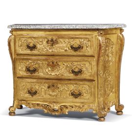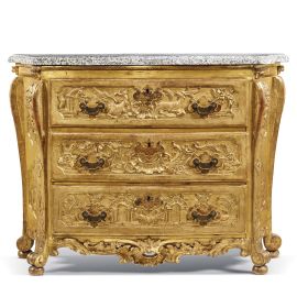 in legno intagliato e dorato con piano in marmo variegato grigio, di linea leggermente sagomata, fronte a tre cassetti centrati da riserve mistilinee ad ospitare decori vegetali, architettonici e animali su fondo bulinato e conchiglia sotto la bocchetta centrale, angoli aggettanti a forma di voluta fogliacea impreziosita da motivi floreali; anche i fianchi, di forma concava presentano medesime decorazioni entro coppia di formelle mistilinee; grembiale centrato da ricca conchiglia rocaille e piedi a ricciolo stilizzato su sfera schiacciata, cm 91x120x53