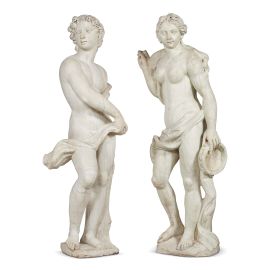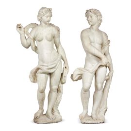 Le statue rappresentano un giovane uomo e una giovane donna, poco più che adolescenti, effigiati quasi interamente nudi, ricoperti solo in minima parte da semplici drappi svolazzanti. La presenza di un cembalo nella mano sinistra della figura muliebre e di una ghirlanda con fiori e foglie sulla testa del giovinetto suggeriscono di identificare i due personaggi con una menade e un baccante, figure mitologiche associate per tradizione al corteo di Bacco, divinità connessa al vino e alla fertilità.