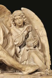 gruppo scultoreo in terracotta raffigurante la scena evangelica nella quale Cristo, ormai morto, viene avvolto in un sudario da due degli angeli inginocchiati al suo fianco, mentre il terzo regge un prezioso vaso contenente l'unguento da spalmare sul corpo; cm 30x65x20; completo di base lignea non pertinente, cm 5,5x64x25,5