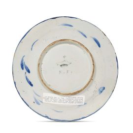 in maiolica monocroma, ampio cavetto con balza breve e tesa orizzontale, piede a disco rilevato. L’ornato “a figuretti e paesaggini” è dipinto con larghe pennellate e ampio uso di pigmento a raffigurare due donne, una delle quali con un mazzo di fiori, che incedono in un paesaggio con colli appuntiti e un casolare. La modalità decorativa trova riscontro in alcune opere delle collezioni della città di Genova, che mostrano marche differenti a dimostrazione della diffusione di questo gusto decorativo. Marca tocco con lettere FF sul retro; diam. Cm 29,2, alt. cm 5