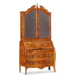 lastronato e intarsiato in legni vari, corpo superiore a due sportelli a specchio sormontati da cimasa sagomata ed elemento in foggia di urna al centro, a celare ripiani rivestiti in velluto con due tiretti nella fascia sottostante; corpo inferiore di linea leggermente sagomata, piano a ribalta che nasconde interno con sportellino centrale, vani e cassetti di varie dimensioni, sotteso da fascia a due cassetti e due ulteriori cassetti sottostanti; grembiale mosso e spigoli stondati delimitati da fascia intarsiata, fianchi dritti; cm 260x119x55