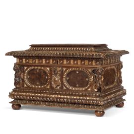 in noce intagliato e lumeggiato in oro, coperchio a urna decorato a più ordini di modanature con due fasce intagliate a baccellatura e unghiatura alternate da foglie aperte agli angoli, corpo di forma rettangolare scandito da riserve ovali separate sui lati lunghi al centro da cherubino reggente cartouche, angoli decorati da profili aggettanti dal corpo di fanciullo e gambe a girali; il corpo è inquadrato da profilatura geometrica superiore e da diversi ordini d'intaglio, mezzefoglie, perlinatura, intaglio vegetale e varie declinazioni di motivo baccellato; poggia su piedini a sfera schiacciata, cm 35,5X55X39,5