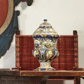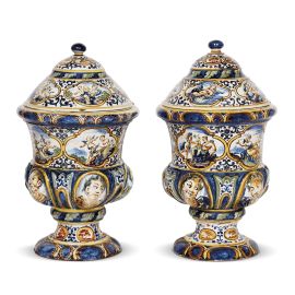 in maiolica decorata a policromia, corpo a balaustro con bordo e base espansi, coperchi a cupola dotati di pomolo arrotondato. La decorazione è coerente in entrambe gli esemplari con un gioco di riserve che si alternano sul corpo con raffigurazioni di personaggi femminili accompagnati da fanciulli o amorini, mentre sulla base le riserve a baccellatura in rilievo contengono ritratti femminili; il decoro è completato da baccellature policrome ed elementi decorativi alla francese delineati in blu di cobalto. I due vasi appartengono a una serie la cui provenienza e attribuzione ha comportato negli anni diverse interpretazioni. Esemplari analoghi sono transitati in collezioni private, pubblicati negli anni settanta con attribuzione dapprima generica e poi vicina all’ambito ligure (Morazzoni; Levy 1964) e quindi per alcuni attribuiti a produzioni lombarde in ambito lodigiano (Conte 1973). Tutti gli studi rimangono comunque concordi circa la datazione, da ascrivere al primo quarto del XVIII secolo. L’attribuzione delle opere ad Agostino Ratti, ipotizzata già da Poggi nel momento in cui vasi analoghi entrarono a far parte delle collezioni dei Musei Savonesi, è attualmente da rigettare. Due esemplari analoghi completi di coperchio sono conservati nelle collezioni della Cassa di Risparmio di Savona, mentre altri tre vasi sono nel Museo della Ceramica di Savona, privi di coperchio e restaurati dopo essere stati danneggiati durante le ultime vicende belliche. A queste ultime opere si faccia riferimento per approfondimento sulla storia degli studi e bibliografia relativa; alt. cm 46, diam. bocca cm 25,5, diam. piede cm 18,8