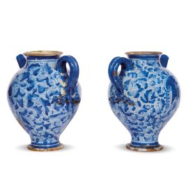 in maiolica monocroma blu, corpo di forma ovoidale su piede piano, ansa a doppia corda desinente a ricciolo e cannello cilindrico. Il decoro si sviluppa su fondo berettino con motivo fitomorfo a foglie bipartite ad incorniciare i cartigli farmaceutici con scritte in caratteri gotici, uno sotteso da figura di drago alato, l'altro da volto di cherubino; alt. cm 24,8, diam. bocca cm 9,5, diam. piede cm 9,5 e alt. cm 25,2, diam. bocca cm 10,2, diam. piede cm 9,6