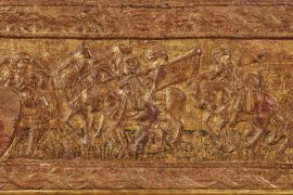 in legno intagliato e pastiglia dorati di forma rettangolare con fondo lavorato a bulino con motivo floreale, raffigura scena processionale incorniciata da fascia a nastrino a racchiudere nastro intrecciato, fiori e intagli geometrici, cm 46x160; montato entro cornice modanata in legno dorato, cm 50x166 complessivamente