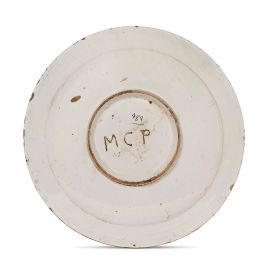 in maiolica dipinta in policromia, mostra al verso una forma tratta da stampo leggermente baccellata secondo canoni più prossimi alle modalità produttive dell’Italia centrale che ad una produzione di ispirazione ligure. Il piatto vede al centro della composizione due putti che sorreggono un emblema araldico, da identificare, che campeggia in un paesaggio alberato con una rocca alla sommità di un monte e una piccola città turrita. L’opera è stata pubblicata da Barile con attribuzione alle manifatture liguri del XVIII secolo, sottolineando la presenza della marca “lanterna”, che tuttavia non è stata rilevata sull’opera. Anche le modalità stilistiche dell’emblema araldico ci paiono prossime alla produzione tardo seicentesca di manifatture liguri o lombarde oppure di quelle del Italia centrale, dove si riscontrano analogie nel senese e in Umbria. Al verso lettere MCP incise a freddo, probabile segno di collezione antica; diam. cm 45,5, alt. cm 5