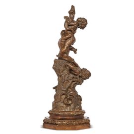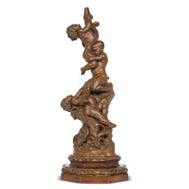 in terracotta patinata raffigurante tre putti su una roccia impegnati a sorreggersi l'un l'altro con un pesce tra le braccia; cm 54,5x21x17 (completo di base lignea modanata di forma esagonale, cm 9,5x26x26)