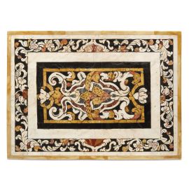 in scagliola policroma di forma rettangolare decorato da una grande riserva centrale con ricco intreccio di girali e fiori incorniciata da un analogo fregio con girali floreali e animali, cm 89x65. Completo di una coppia di sostegni in ferro battuto, cm 54x57x32 ciascuno