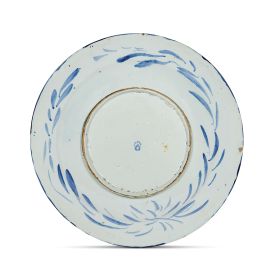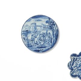 in maiolica dipinta in monocromia azzurra con tesa orizzontale e ampio cavetto, L’intera superficie del fronte è decorata con una scena che raffigura Il riposo del re Ferdinando II durante l’assedio della città di Siviglia, da una incisione tratta dal libro di J. Antoni de Vera (Milano 1632), sullo sfondo paesaggio con architetture in lontananza e una quinta arborea. Al verso decoro con piantine “alla cinese” e al centro la marca scudo in azzurro, tradizionalmente attribuita alle fornaci di Savona; diam. cm 39 alt. cm 5,8