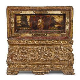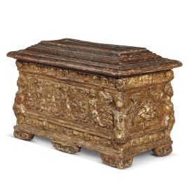 in legno intagliato e dorato con rilievi in pastiglia, fronte riccamente decorati con figure alate tra festoni vegetali e candelabre, fianchi centrati da grande mascherone, angoli scanditi da grandi arpie ad ali spiegate. L'interno del coperchio è dipinto con una cornice rettangolare decorata da riserve ai centri e agli angoli, all'interno della quale spicca una scena policromia con figura allegorica entro paesaggio alberato, dipinta in uno stile che ricorda l'ambiente senese di Bartolomeo Neroni detto Il Riccio; cm 63x98x57