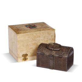 in ferro di forma rettangolare con coperchio a botte incernierato sormontato da maniglia, di chiara derivazione rinascimentale. L'intera superficie mostra un decoro a rilievo con grottesche e animali fantastici, inquadrato entro cornici puntinate; cm 9,5x14x9,8. Conservato entro scatola in legno rivestito in pergamena con stemma araldico dipinto sul coperchio; cm 14,5x18,2x13,8