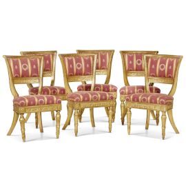 in legno intagliato e dorato con rivestimento in stoffa rossa con decori dorati, composto da divano, due poltrone e sei sedie; braccioli lineari sorretti da animali alati su zampe ferine, fascia frontale decorata a motivi stilizzati a rilievo, gambe anteriori tornite e posteriori a sciabola; divano cm 92x160x64, poltrone cm 88x60x62, sedie cm 90x50x52