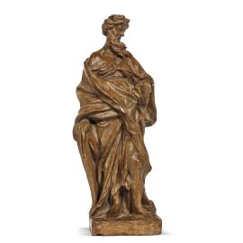 in terracotta patinata raffigurante Mosè, la mano destra poggiata sulle tavole della legge e la sinistra a reggere un lembo del mantello, che ricopre la lunga veste con ampi svolazzi segnati da pieghe profonde; cm 39x14,5x12