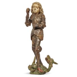 in legno dipinto in policromia e argentato a mecca raffigurante San Giorgio e il drago, cm 69x34x19