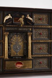 in legno ebanizzato con applicazioni in bronzo dorato, fronte centrato da vano apribile a sportello inquadrato da due colonne a sorreggere timpano su cui giacciono tre figure di putti, affiancato ai lati da una doppia colonna di quattro cassetti ciascuna. L'intera superficie mostra un fitto decoro a rilievo in lamina d'argento a racemi sviluppati su ciascun cassetto intorno ai pomelli; fianchi decorati da filettature geometriche centrati da maniglie in bronzo dorato, poggia anteriormente su elementi angolari in foggia di leone, mentre posteriormente su sfere schiacciate, cm 42x83x35