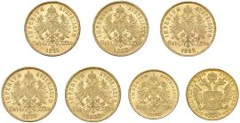 AUSTRIA. CINQUE MONETE DA 20 FRANCHI E DUE MONETE DA 10 FRANCHI ORO
