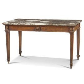 in noce con piano rettangolare in marmo, sulla fascia e agli angoli presenta decorazioni in foggia di fiore aperto dorato, gambe troncoconiche scanalate su piede a trottola, cm 90,5x154x79