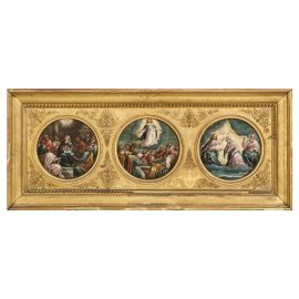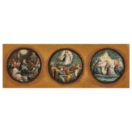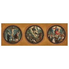 cinque predelle con quindici tondi suddivisi in gruppi da tre, olio su tela, cm luce 15,5 (ciascuna), cm 65x22,5 (totale)