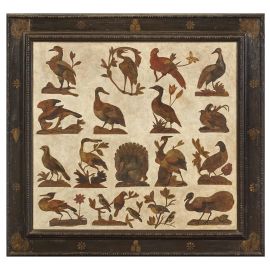 realizzato con la tecnica del collage su tela, raffigurante bestiario di tipo ornitologico, cm 124x135, entro cornice a cassetta in legno dipinto e dorato
