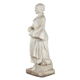 statua in marmo, la donna vestita in abiti popolari porta a tracolla un organetto a manovella, mentre da una scatola ai suoi piedi esce un roditore; cm 162x46x55