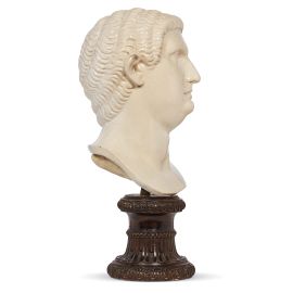 in terraglia raffigurante la testa dell'imperatore Otone (imperatore nel 69 d.C.), cm 36,5x22x22; montata su base tornita in legno intagliato