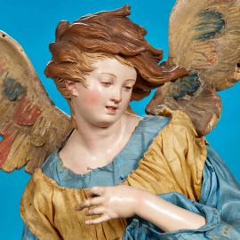 testa in terracotta policroma, mani e piedi in legno dipinto, occhi in vetro, manichino in fil di ferro ricoperto di stoppa con ali in legno policromo, abbigliato con veste in seta celeste e camicia gialla, alt. cm 37 (la figura)