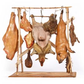 in terracotta, composto da: un mezzo maiale grande, un mezzo maialino, una mezza vacca, una pecora, un gallo, due cosce di maiale, un prosciutto, un lardo; da cm 28 a cm 9