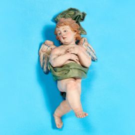 in terracotta policroma, occhi in vetro, uno con svolazzo verde, l’altro con svolazzo color cipria, cm 15x9x8 ciascuno