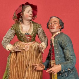 testa in terracotta policroma, mani e piedi in legno dipinto, occhi in vetro, manichino in fil di ferro ricoperto di stoppa, abbigliata con abito con corpetto stretto da cordino rosso e impreziosito da ricami in oro e gonna in seta verde, maniche grigie ornate da boccioli di fiore e dai risvolti rosa, camicia in pizzo chiusa da doppio bottone argento, grembiule a righe fermato in vita da nastro rosa, fazzoletto in seta rossa e bordo in pizzo dorato raccolto sulla testa a mostrare sontuosi orecchini, alt. cm 37