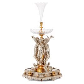 in metallo argentato e dorato e vetro, quattro baccanti danzano attorno a fusto centrale su basamento modanato di forma circolare circondato da quattro figure di amorini seduti, su base squadrata, cm 98x42,5x42,5