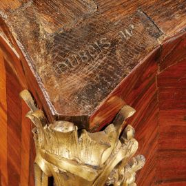 L’esemplare che vi proponiamo raccoglie tutte le caratteristiche dei mobili nello stile Dubois: dagli intarsi a motivo floreale e rocaille, all’utilizzo della lacca cinese su fondo nero con citazioni dall’Oriente alle sinuose applicazioni in bronzo finemente cesellato e dorato con elementi fogliacei, rocaille e a foglie d’acanto.
