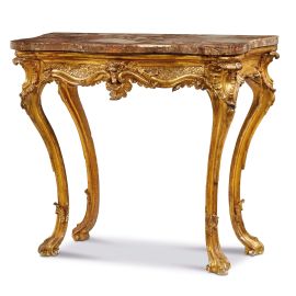 in legno intagliato e dorato a mecca, con piano in breccia rossa di linea sagomata su fascia riccamente intagliata con motivo rocaille, centrata da bouquet di fiori e grandi foglie aperte agli angoli, su sinuose gambe terminanti a ricciolo, cm 93x105x53