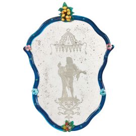 in vetro blu con applicazioni policrome di fiori e frutta, di forma sagomata, cm 65x46