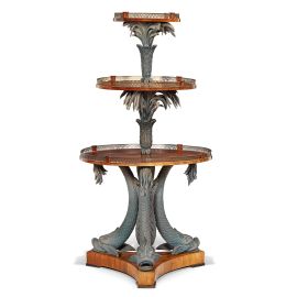 a tre ripiani circolari in mogano chiaro e legno dipinto a finto bronzo, i piani digradanti bordati da ringhiere in metallo traforato con motivi ad arco, supporto centrale interamente scolpito con motivi di erbe palustri, foglie d’acanto sovrapposte e nella parte inferiore con tre delfini fantastici poggianti su base triangolare, piedini piatti a pianta quadrata in legno ebanizzato, cm 155x78x78