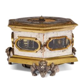 in ottone dorato e rame argentato, quadrante circolare con numeri romani montato su coperchio lavorato a bulino, cassa di forma esagonale con lati centrati da riservein vetro che lasciano intravvedere meccanismo, poggia su tre piedini in foggia di leoni; meccanismo interno interessato da ricca decorazione a mascheroni, animali fantastici ed elementi vegetali firmato Detloff (Detleff?) Johan Haffshein, cm 10,5x17x14