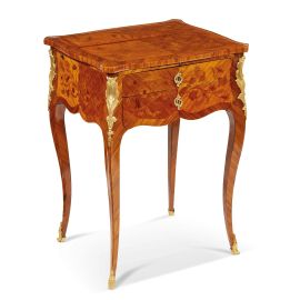 lastronato e intarsiato in legni vari, con applicazioni in bronzo dorato sui fianchi e agli angoli, fronte e fianchi presentano intagli a bouquet di fiori, doppio cassetto uno dei quali contenente porta inchiostro, tablette estraibile, meccanismo che permette di sollevare scarabattolo interno a doppio sportello, poggia su sottili gambe arcuate, cm 74x54x46