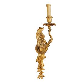 in bronzo dorato, sostegno a volute fogliacee da cui si sviluppa ramage su cui poggia un pappagallo e termina in bobeche, cm 44x12x17,5