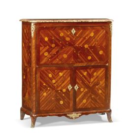 lastronato e intarsiato in legni vari, piano in marmo breccia gialla e applicazioni in bronzo dorato; fronte e fianchi di linea lievemente sagomata interessati da lastronatura a bois du violette e intarsio a ramage e boccioli di fiori; lo sportello superiore apribile a ribalta presenta un piano scrittoio in cuoio e cela tre mensole e sei cassetti, mentre i due sportelli inferiori celano due mensole e un vano apribile a ribalta; angoli superiori, gambe anteriori, bocchette e pendaglina ornati da applicazioni in bronzo cesellato e dorato in foggia di motivi vegetali, cm 126,5x114x46,5