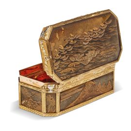 in oro con pannelli in lacca giapponese e montatura in oro a quattro colori, presenta punzoni dell'orafo, della città e dell'anno (D coronata), cm 3x8,3x4A FRENCH SNUFF BOX, 1767-1768