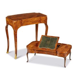 lastronato in legni vari e guarnito con bronzi dorati, composto da tavolino e vassoio ad incastro con tablette estraibile in cuoio e scomparti laterali con apertura a libro, fascia con stretto cassettino centrale e gambe sagomate in legno più scuro a formare gli angoli del tavolino sottostante; il tavolino di forma sagomata è anch'esso interamente lastronato in varie essenze e ospita un unico cassetto sul fianco destro, lunghe gambe sinuose e scarpette in bronzo dorato. Reca due marchi a fuoco sotto il vassoio e sotto al corpo del mobile, cm 72x65x40,5 (vassoio alt. cm 24,5)